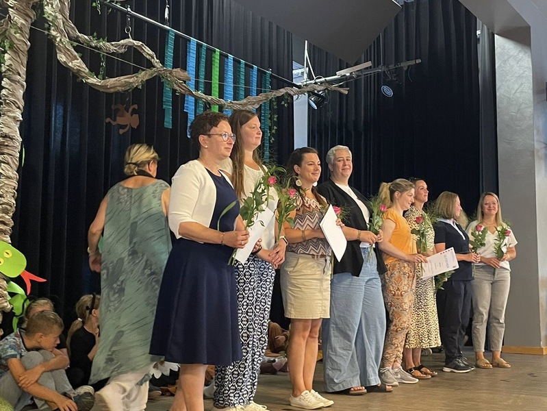 Am 19.8.25 war es soweit, der große Tag für unsere neuen E1er war da. Im vollen Bürgerhaussaal wurden alle neuen Schülerinnen und Schüler und ihre Familien durch Frau Auell begrüßt und an der EAS willkommen geheißen. Mit einem spannendem Theaterstück "Vom Löwen der nicht schreiben konnte" von der Theater AG unter der Leitung von Frau Lizenberger und einem musikalischen Beitrag des Jahrgangs 2 wurde die Feier zu einem tollen Event für Groß und Klein. Daran anschließend erlebten die neuen Schulkinder ihre erste Schulstunde, während sich die Familien bei Kaffee und Kuchen kennenlernten. Wie aufregend für alle!!! (August ´25)