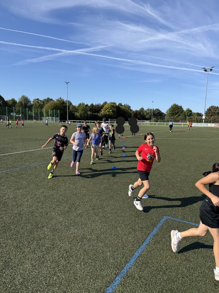 Am 19.9.25 trafen sich die Jahrgänge E2 bis 4 im Lossetalstadion um die Bundesjugenspiele zu erleben. Nach dem gemeinsamen Aufwärmen durch Frau Vanvlodorp verteilten sich die Klassen an die einzelnen Stationen. Dieses Mal halfen uns eine Gruppe von Eltern bei der Durchführung. Sie erklärten, maßen Sprung- und Wurfweiten, stoppten Zeiten und feuerten an.