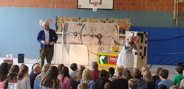 den Drittklässlern der EAS in der Sporthalle auf den Beginn des Stücks The Mice In The Clock, Dann war es soweit und die beiden Mäuse, Mr Arthur Mouse und Mrs Isabel Mouse, erschienen mit ihren